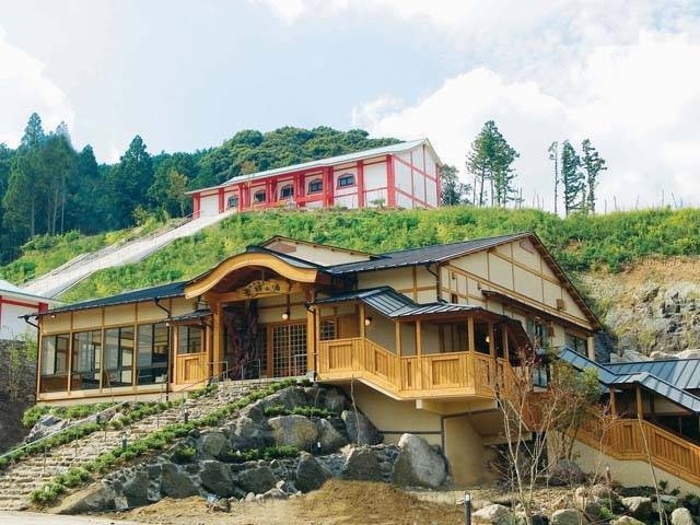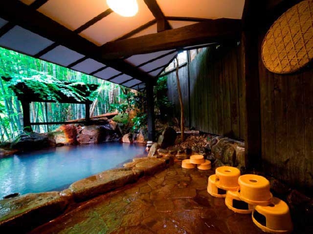 黒が基調の古民家ふうの建物に、山の斜面や自然を生かした風呂が並ぶ。木々や滝を目の前にする男女合わせて13の露天風呂、溶岩や木炭を使った4種類の貸切露天風呂がある。