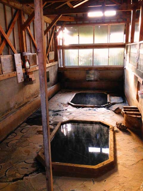 温泉の発祥は文久3(1863)年、創業は明治15(1882)年という歴史ある共同温泉。昔日の湯治場がしのばれるレトロな雰囲気がある。温泉は敷地内の数ヶ所から湧き出ており、浴場の下から湧き出すぬるめの湯と、熱い湯を混ぜて温度を調節している。創傷や皮膚病によく効くという。