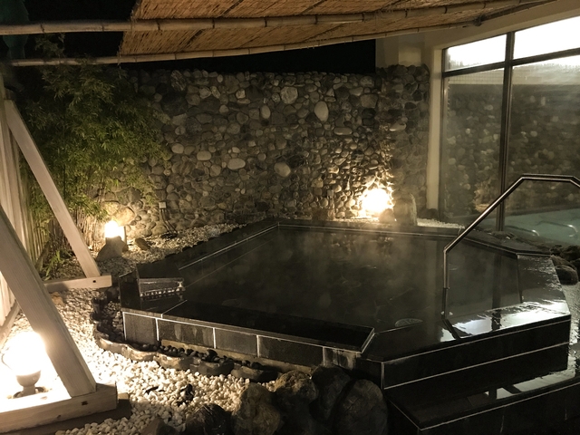 江戸時代の本陣をイメージした建物は、白壁と黒い梁が重厚な雰囲気。海水を汲み上げた露天風呂の汐湯がある。大浴場は広々とした御影石の浴槽で、ゆっくりと湯につかれる。