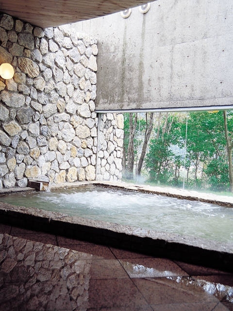 祖谷渓谷入り口にあり、茅葺き民家をイメージした建物が印象的。地元産のヨモギなどを使った薬湯は、リラクセーション効果がある。阿波青石で造られた大浴場は明るく開放的だ。