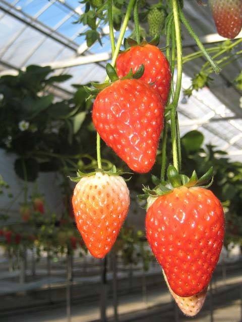 アクアロマン駒ヶ根園では、45分の食べ放題でいちご狩りが楽しめる。いちごは1200坪の敷地でアルプスの雪解け水を使って栽培されている。1mの高さで栽培されているので摘み取りやすい。