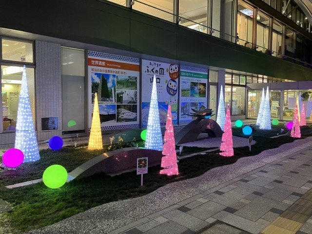 山口宇部空港が舞台のイルミネーション。ターミナルビル前の植栽を、七色に変化するカラフルな球体や、まるでツリーのような円すい形のライトも加えて鮮やかに彩る。