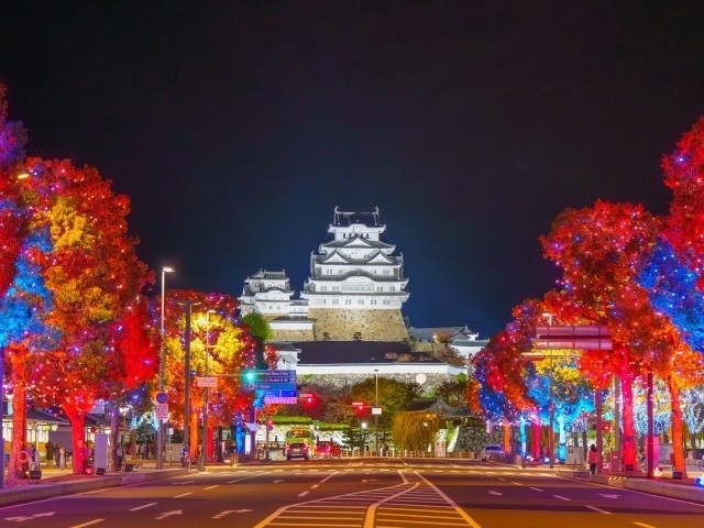 JR姫路駅と姫路城を一直線に結ぶ大手前通りを上質なイルミネーションで華やかに彩るイベント「大手前通りイルミネーション」。3度目となる今年も世界的照明デザイナーである石井幹子氏監修のもと、実施エリアを総数25万球のフルカラーLEDで装飾し、姫路城の彩雲ライトアップと連動した統一感のある光の演出を行う。
