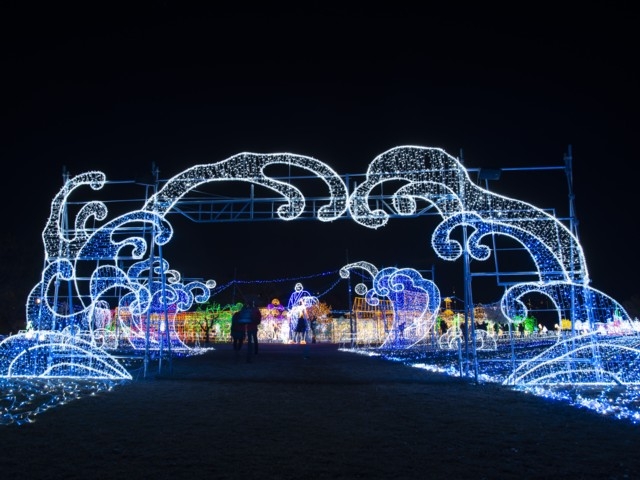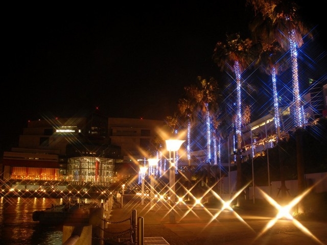 イルミネーションが輝く海辺の散歩道