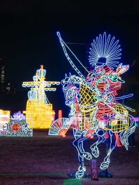 今年のテーマは「豊臣の夢 天下一統 」。豊臣が描いた理想、そして徳川が実現した未来を、光と音で幻想的に描き出す。大阪城の荘厳な天守閣、威厳に満ちた武者の姿、きらびやかな甲冑と兜、さらに本年は、全身の侍武者を中心とした立体展示を大幅に拡充。まるで夢の中に迷い込んだかのような、時空を超えて歴史に没入するような体験が広がる。昨年好評だった「大阪イルミ観光地シリーズ」も引き続き展開。通天閣、道頓堀、たこ焼き、など、大阪を象徴するスポットが色鮮やかにライトアップされ、賑やかで親しみやすい大阪の風景を再現する。