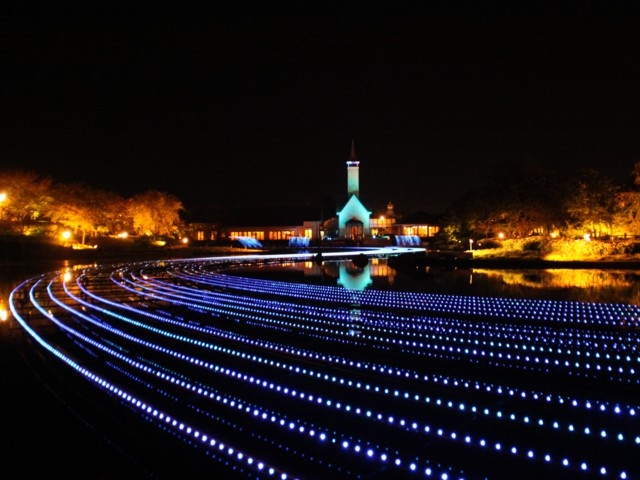 なばなの里は「長良川水辺の夢のような小さな村」をコンセプトに造られた、花と緑と食のテーマパーク。池を中心にした園内にはライトアップが施され、国内最大級のイルミネーションになる。季節の花々との競演が翌年の5月まで楽しめるイチオシのイルミネーションスポットだ。園内の長島ビール園では3種の地ビールが味わえるので、光に彩られた庭園を眺めつつ、美味しいビールを堪能してみてはいかが。