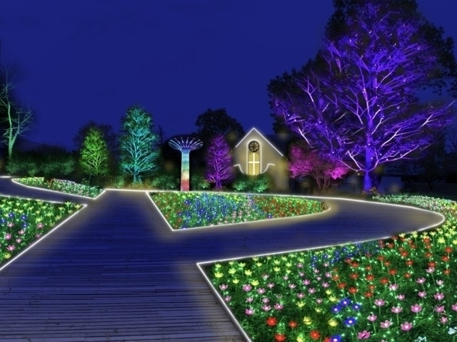 24回目の開催となる今季の「ひかりのすみか」は、「マジックフォレスト」をテーマに約550万球の光で幻想的な世界を体感できる。20mのシンボルツリーはデザインを変え、富士山をイメージ。トンネルの元祖といわれる約300m続く「光のトンネル」は、煌びやかに輝く光と音の没入感を楽しめる。「王宮の丘」では、青い光に包まれながら進む「ヒカリの散歩道」、その先には最高到達点150mを誇る圧巻の噴水レーザーショーを楽しめる。ライトアップされた世界最大級の「愛の鐘」やフォトスポットが点在する。