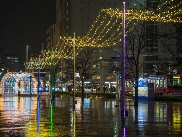 富山の冬の夜をやわらかく包み込む、ホワイトイルミネーション。城址大通りの26本のLED樹木イルミネーションに加え、富山駅南口・北口駅前広場にライトトンネルとライトポールが登場。七色に変化するネオンの輝きで富山駅周辺が華やかに彩られ、撮影スポットとしてもおすすめ。ひかり輝く非日常的な空間を楽しんで。