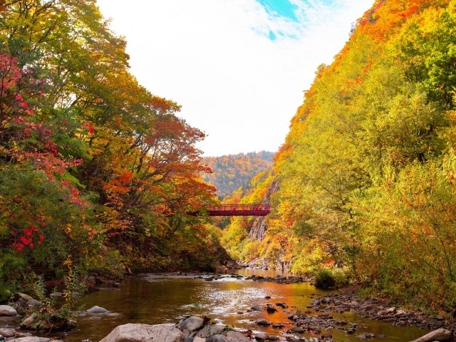 層雲峡は大雪山の山々への足がかりとなる温泉街。ロープウェイとリフトで黒岳(1984m)の7合目付近まで上がると、日本で最も早い紅葉が眺められる。ナナカマドやカエデなどの色づきは、ここから層雲峡まで約1ヶ月かかって下りてくる。層雲峡付近は峡谷が最も美しく、国道沿いを散策するだけでも楽しい。