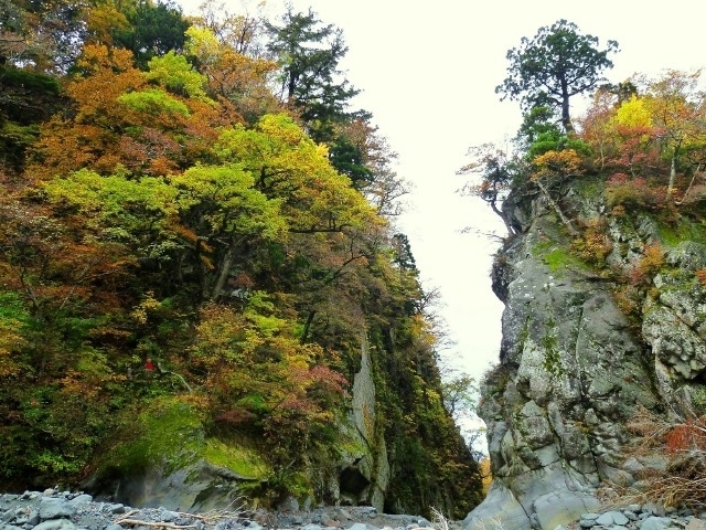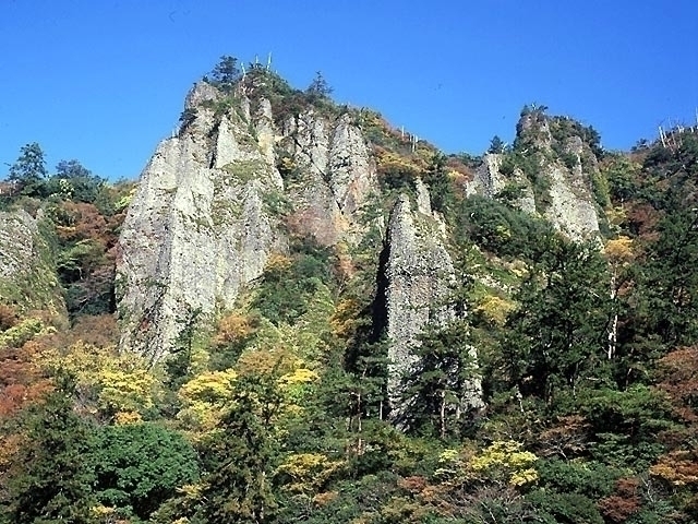 神戸川上流の渓谷。奇岩・柱石が2kmにわたって続き、「山陰の耶馬溪」といわれている。国の名勝・天然記念物に指定された紅葉の名所でもある。渓谷沿いの遊歩道は一周が30分ほど。途中2つの吊り橋があり、歩くとゆらゆら揺れてスリリングだ。散策コースを楽しみながら、モミジなどの紅葉も満喫できる。