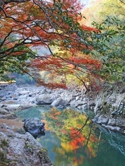 西中国山地の原始林を深く切り込んだ、全長16kmにおよぶ大峡谷。秋は峡谷全体が紅葉し、「五大壮観」と呼ばれる黒淵、猿飛、二段滝、三段滝、三ツ滝がそれぞれ抜群の景観を呈する。岩壁から赤や金色の輝きを放つモミジがのぞき、エメラルドグリーンの水面との神秘的な風景に魅せられ多くの人が訪れる。
