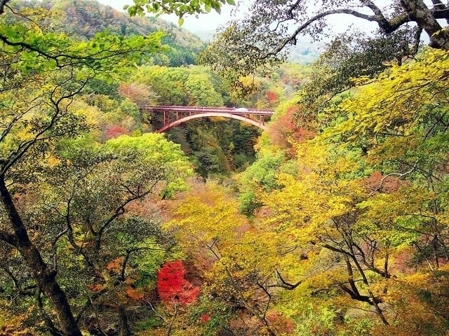 阿武隈川上流に約4kmにわたって続く雪割渓谷の切り立った絶壁に架かるのが雪割橋。5代目となる新たな雪割橋が完成し、橋周辺の絶景と色づいたミズナラやカエデなどの鮮やかなコントラストは一見の価値あり。