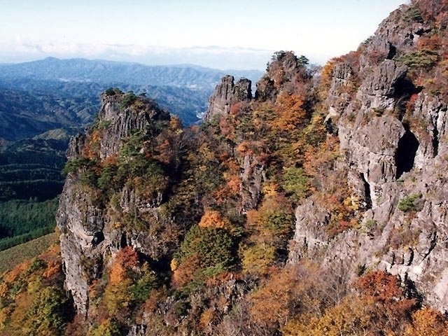 宮城県との県境に近い標高約825mの奇岩からなる霊山は、約1500万年前の火山活動で生まれ、「新日本百名山」に選定されている。貞観元(859)年に慈覚大師円仁によって開山され、東北山岳仏教の中心地として栄えたという。岩山を点々と彩るモミジやナラの色合いは独特で力強さも感じられる。山中のハイキングコースからは、太平洋も眺められる。