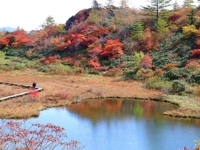 堂々とした山の姿と沼のたたずまいを彩る紅葉