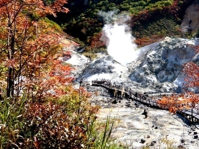 登別地獄谷は日和山の噴火活動によりできた爆裂火口跡。直径約450m、面積約11haもあり、ここから温泉が1日1万トンも湧出しており、温泉街のホテルや旅館に給湯されている。また、谷に沿った噴気孔から立ち上る湯けむりは環境省の「かおり風景100選」にも選定された。周辺はナナカマドやヤマウルシなどが色鮮やかな紅葉の名所。