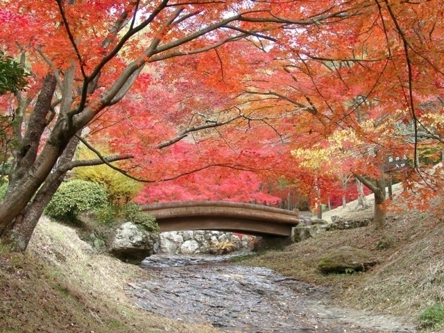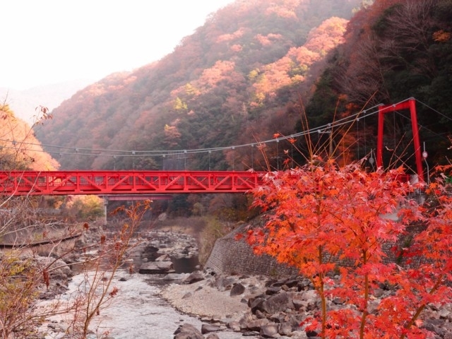 JR宝塚駅からわずか電車で8分、武庫川上流の渓谷沿いにあり、秘境のような雰囲気を楽しめる温泉地。自然豊かで、秋には山々が紅葉で赤く染まり、赤い吊り橋や渓谷との美しい調和が楽しめる。無料開放されている足湯もあるので、ハイキング後に立ち寄ってみるのもいい。