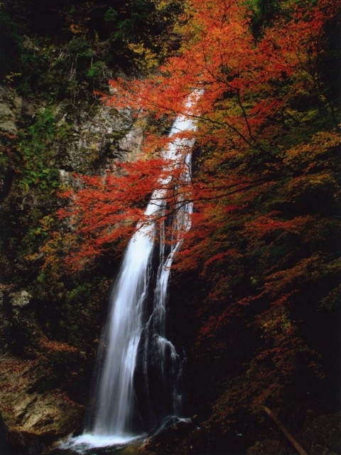 3段の岩肌を滑り落ちる滝と紅葉のコントラストが美しい