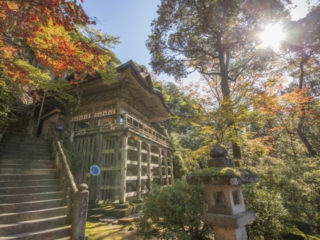 養老元(717)年にまで歴史を遡る真言宗の名刹。境内には、様々な重要文化財が点在していて歴史が感じられる。ここを訪れた松尾芭蕉は「石山の石より白し秋の風」と詠んだ。境内はイロハモミジ、ヤマモミジなどで赤く染められ、優美な眺めとなる。