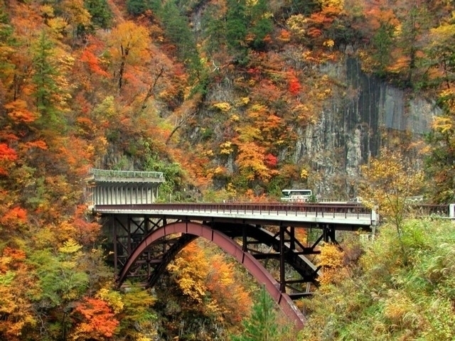 石川県白山市と岐阜県白川村を結ぶ全長33.3kmの山岳有料道路。標高差が約800mあり、最高地点の三方岩駐車場(1450m)で10月上旬に始まった紅葉は、ブナの原生林や「日本の滝100選」に選ばれた「姥ヶ滝」など、白山の雄大な自然を錦秋に染めながら徐々に山を下りていき、11月上旬までの約1ヶ月間楽しむことができる。