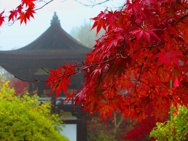 鮮やかな深紅の紅葉が堂宇に映える