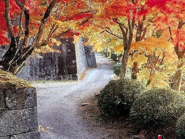 国指定史跡であり、別名「臥牛城」。標高325m、谷底との高低差は約100m、島津軍を退けた堅城として有名だ。文治元(1185)年に築城され、明治維新後に廃城となる。瀧廉太郎の『荒城の月』のモチーフとなった場所でもあり、随所で真っ赤なモミジやカエデが観賞できる。