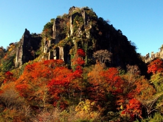 県道43号沿いに1kmにわたって奇岩が連続する、裏耶馬の代表的な景勝地。折り重なり、天を突き刺すように屹立する岩峰や岩壁を彩るツタやカズラなどが見事で、秋は鮮やかに色づきすばらしい景観をつくり出す。