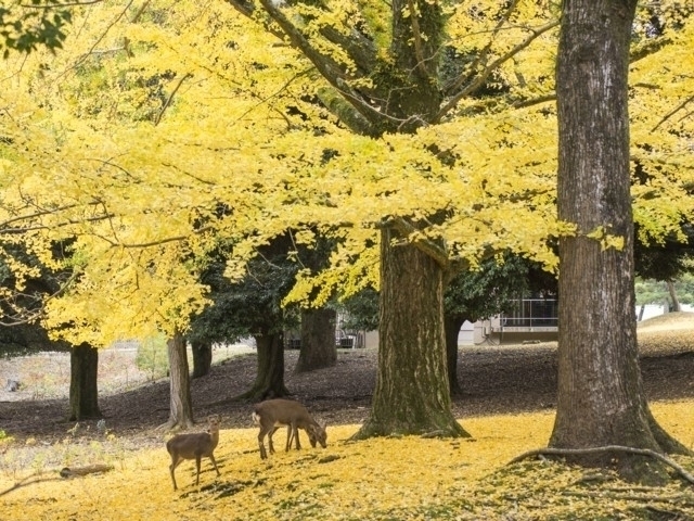 春日大社や興福寺、東大寺、国立博物館など、数々の社寺や文化施設が隣接する広大な公園。天然記念物の「奈良のシカ」が見られることでも有名だ。モミジやイチョウなど多種類の紅葉が秋から初冬まで楽しめ、若草山を背に園内随所で様々な秋の情緒をかもしだす。