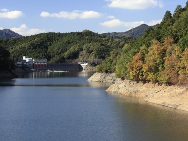 春は桜、秋には紅葉が楽しめる、周囲約32km、水深約45mのダム湖。遊覧船やボート遊び、釣り、カヌー体験ができる。吊り橋からの眺めが美しく、またハイキングやサイクリングをしながら湖畔に映える紅葉が楽しめる。