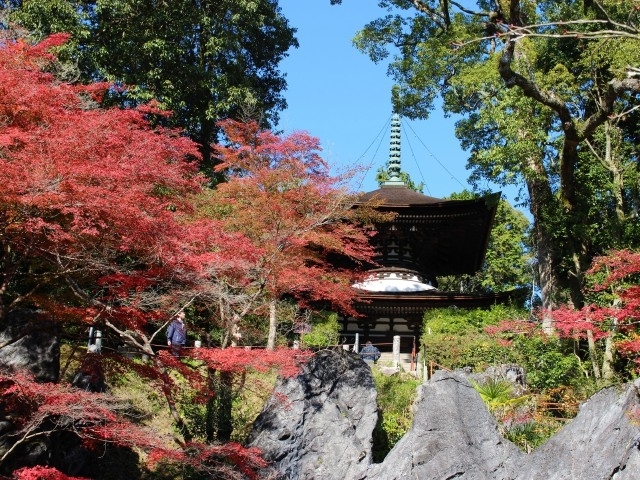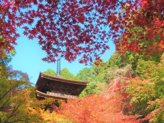 鈴鹿山脈西麓に点在する「湖東三山」はどの寺も紅葉が美しいが、特に金剛輪寺のヤマモミジやトウカエデの紅葉はその鮮烈な色合いから「血染めの紅葉」の名で知られている。1200年以上前に聖武天皇の勅願で行基が開山。境内には国宝の本堂、国指定重要文化財の二天門と三重塔、国指定名勝庭園がある。例年紅葉期には、秘仏日本最古の大黒天(金運の神)が特別公開される。