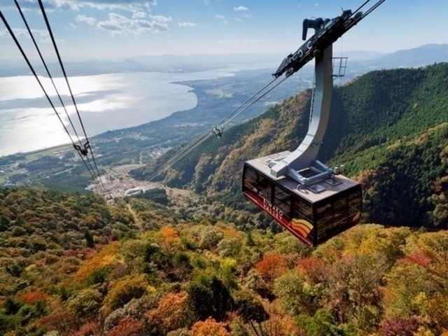 桜、新緑、紅葉、雪景色と四季を通してさまざまな表情が楽しめるびわ湖バレイ。秋には山一面がカエデやミズナラなどの木々で色付く。標高1100mの山頂まで到着するびわ湖バレイロープウェイからは眼下に広がる美しい紅葉が楽しめる。山頂から眺める琵琶湖はまさに絶景。
