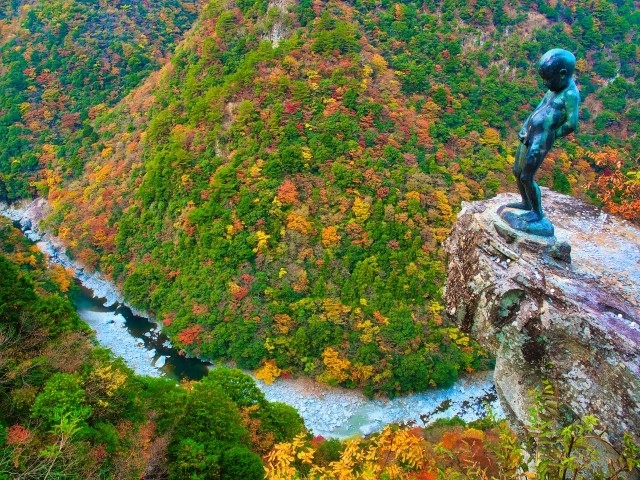 祖谷川の下流に、20kmにわたって続く渓谷。四国山地の主脈を横断する急流が、数十mから数百mの断崖絶壁をつくり出している。祖谷街道沿いの岩の上には、かつて地元の子どもや旅人が度胸試しをしたという逸話をもとにつくられた小便小僧が立つ。秋には谷底から峰まで全山が紅葉し、車やバスからも眺めることができる。