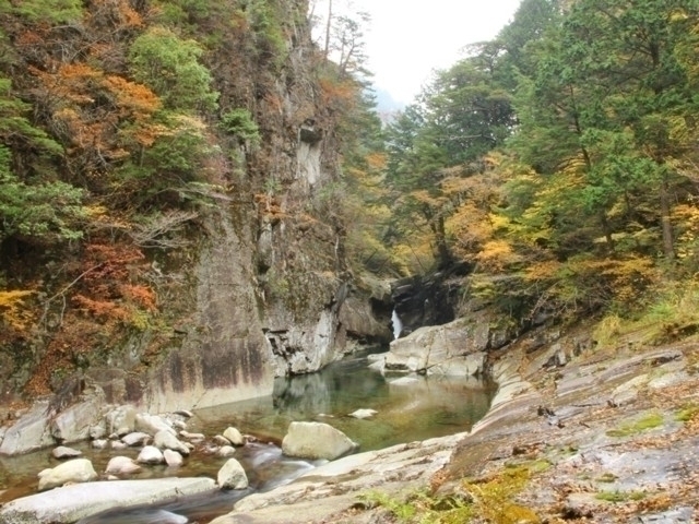 標高1541mの明神山から流れ下る中津川が刻んだ渓谷。秋には、紅葉に染まった紅葉瀧や竜宮渕、雨竜の滝、石柱などを訪れる人でにぎわう。1.1kmの遊歩道は、秋を感じながらの散策が満喫できる。
