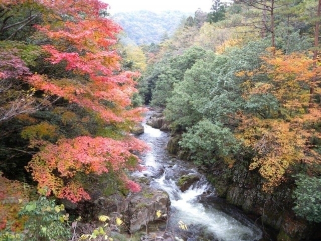 神戸川上流の渓谷。奇岩・柱石が2kmにわたって続き、「山陰の耶馬溪」といわれている。国の名勝・天然記念物に指定された紅葉の名所でもある。渓谷沿いの遊歩道は一周が30分ほど。途中2つの吊り橋があり、歩くとゆらゆら揺れてスリリングだ。散策コースを楽しみながら、モミジなどの紅葉も満喫できる。