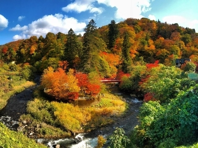 「三途川」(冥土への路)という名称が示すとおり、渓谷の奥にあるのは「川原毛地獄」。青森県の恐山、富山県の立山と並ぶ日本三大霊地の一つだ。渓谷の断崖絶壁には高さ約40mの橋が架かり、そこから真っ赤に色づいた渓谷を眺めると、美しい紅葉風景も少し足がすくみそうだ。