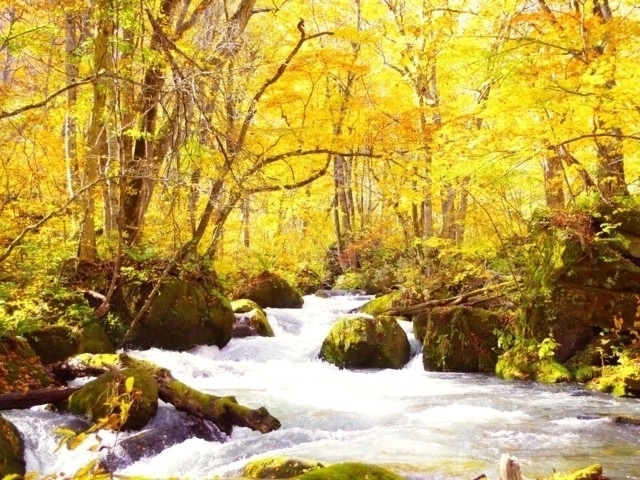 十和田湖から唯一流れ出ている奥入瀬川。湖畔から約14km続く奥入瀬渓流は十和田湖とは対照的に躍動感のある流れが印象的。うっそうとした樹木に覆われ、渓流にはツツジやカエデ、岩には苔が見られる。ブナ、カツラ、トチノキ、モミジ、カエデなどに染め上げられた渓流は遊歩道を散策して初めて本当の魅力が感じられる。