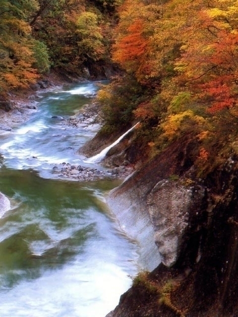 迫力ある断崖絶壁の峡谷を色とりどりに染める紅葉