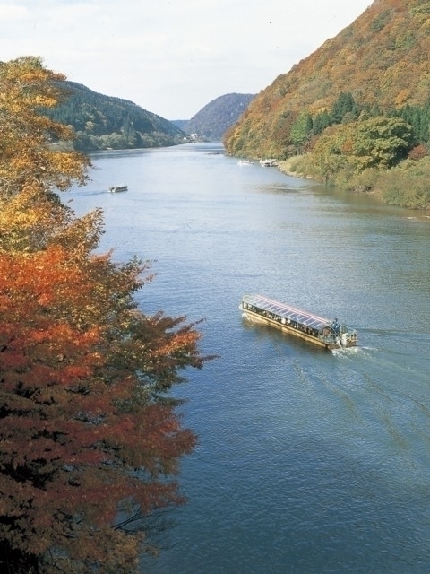 最上川の下流に位置する最上峡は、紅葉だけではなく、天然杉の巨木が点在していることでも有名。ドライブで車窓から眺める最上峡もすばらしいが、やはりはずせないのが舟下りだ。紅葉と水面の美しいコントラストを愛でながら、船頭さんの舟唄や絶妙なガイドが楽しめる。