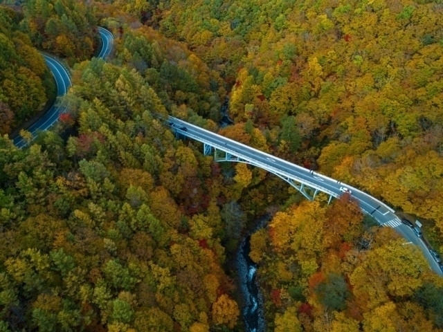 八幡平の山頂エリアは、十和田八幡平国立公園内にあり、ドライブするなら全長約27kmの「八幡平アスピーテライン」ははずせない。全国でも有数の美しい紅葉が楽しめるこのルートは、カーブを曲がるたびに次々と秋の絶景が広がる。ブナやカエデが美しく色づいたさまは実に見事だ。