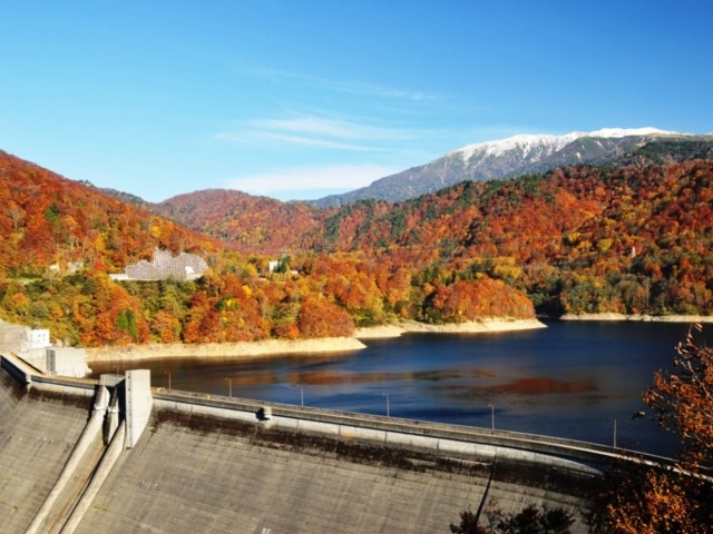 岐阜との県境近くにある有峰湖は、昭和36(1961)年に建造されたダムによってできた人造湖。湖の周囲には登山やハイキングに適した遊歩道が整備されているほか、キャンプ場などの設備もあるので、思い思いの方法で紅葉が楽しめる。美しい紅葉の景色を満喫しよう。