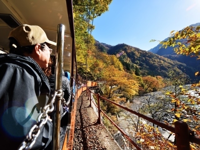 赤や黄に染まった黒部峡谷の深い谷の中をトロッコ電車が走り抜ける。黒部川の清流と針葉樹の緑が峡谷の紅葉を一段と際立たせる。今シーズンは途中の猫又駅までの折返し運行となるが、鮮やかな自然美を十分に堪能することができる。またこの猫又駅は、日本で唯一駅名に「猫」が付く駅であるとともに普段下車できないが期間限定で下車可能となっている。トロッコ電車車窓からや猫又駅にて全山紅葉の絶景を楽しむことができる。