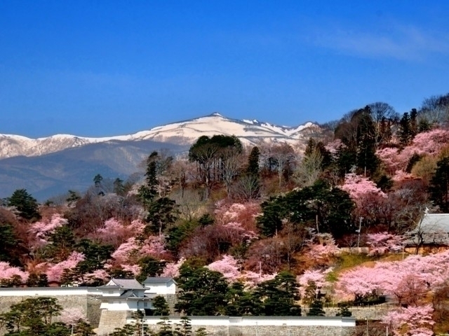 白虎隊の悲話で知られる、鶴ヶ城の跡。ソメイヨシノのほか、ヤエザクラ、シダレザクラなどが、次々に美しい花を咲かせる。赤い瓦の天守閣と、見事に咲き誇った桜の調和がすばらしい。2023(令和5)年4月に天守閣がリニューアルオープンし、入場可能となった。