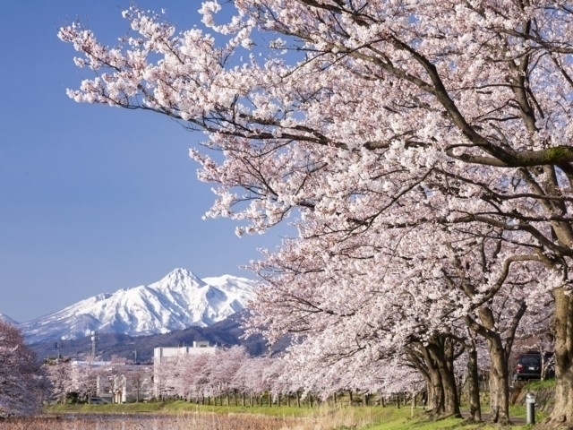 残雪の岩手山を背景に、水面に映える桜並木を愛でよう