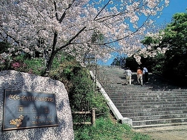 小高い丘にあり、展望台や遊歩道が整備された公園。園内は忠元神社を中心に約2kmにわたって桜並木が続く桜の名所で、春にはたくさんの花見客でにぎわう。千本桜として有名で「さくら名所100選」にも選定されている。公園をぐるりと囲むように植えられている桜は、圧倒的な美しさで見る者を魅了する。
