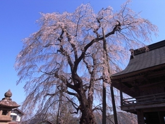 鳥が翼を広げたような樹形が見事な「長瀬の大しだれ桜」は、その樹齢が約430年といわれている。開花期を迎えた淡紅白色の花は見ごたえ十分で、県の天然記念物に指定されている。個人宅なので庭に入る場合は要問合せ。