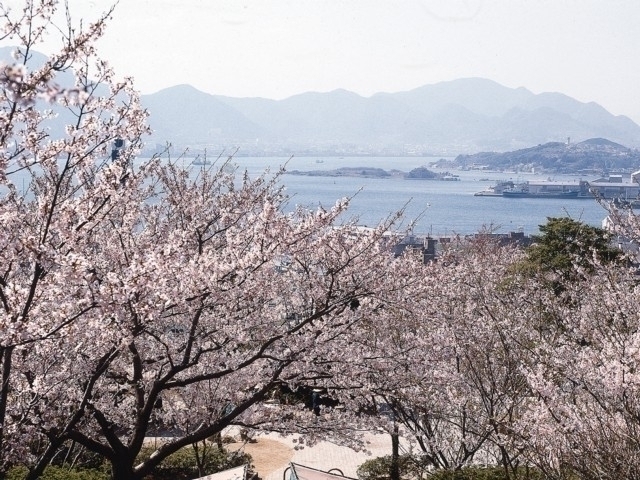 展望台からは市街地を望め、お花見のシーズンには、下関で最もにぎわう桜の名所。公園を包み込むかのように、約320本のソメイヨシノが咲き誇る。桜の見頃には露店が立ち並び、お花見が満喫できるスポットだ。
