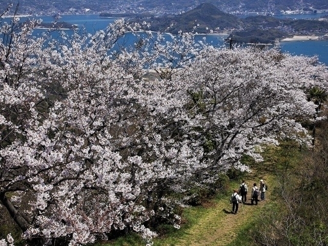 瀬戸内海に浮かぶ岩城島の中央に位置し、「岩城富士」とも呼ばれる積善山。山頂へ向かう山沿いには、さまざまな桜が咲き、「三千本桜」といわれ親しまれている。岩城港・小漕港から山頂へは車でも行けるが、徒歩でも2時間ほど。山頂の展望台から眺める瀬戸内海の多島美はまさに絶景だ。山頂付近の桜は2025年2月から順次植替えをおこなっている。