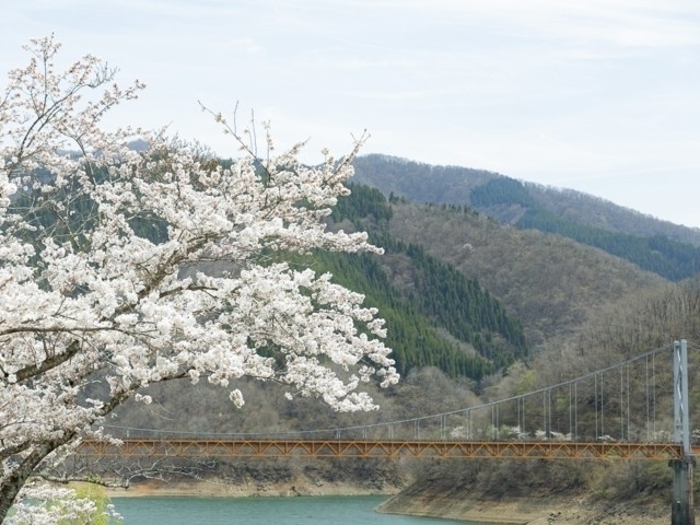 1971(昭和46)年に俳人・山口誓子氏の呼びかけにより、九頭竜湖岸にソメイヨシノやヤエザクラなどが植樹されたのが始まりで、今では約1800本の桜が湖畔を華やかに彩っている。市街地の桜が散り始めた頃に咲き始めるため、遅めのお花見にはぴったりだ。