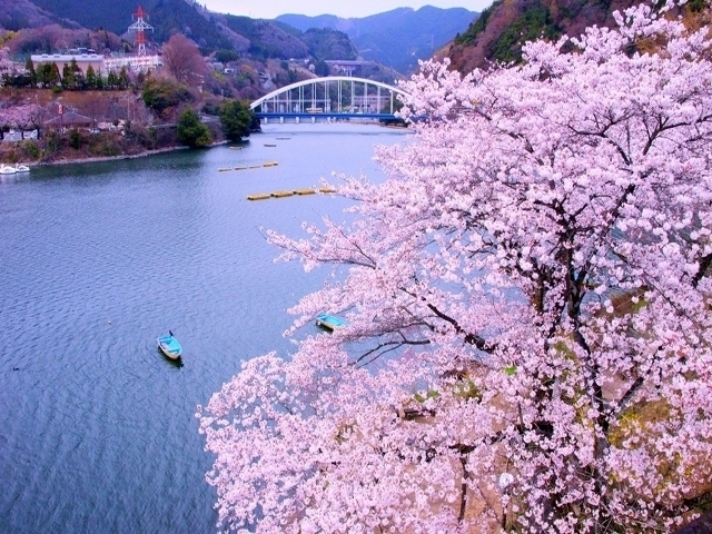 相模湖畔には桜の木が湖を囲むように各所に植えられている。お花見の季節には桜を眺めながらボートや遊覧船、釣りを楽しむ人も多い。うららかな陽射しの中で桜に囲まれゆっくり時を過ごそう。