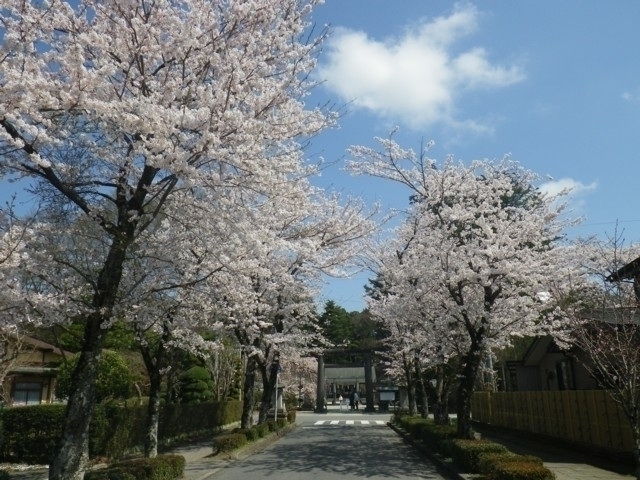 参道・境内を中心に、ソメイヨシノなど約150本の桜が咲き乱れる。1kmにおよぶ参道の両側をトンネルのように桜が覆い、行き交う人々の目を楽しませてくれる。また、赤みの強い花の咲く珍しいヨコハマヒザクラが境内外庭に1本あり、この桜の前で記念撮影をする参拝者も多い。花の香りに包まれた桜のトンネルを、ゆっくりと時間をかけて歩きながら春の風を感じたい。