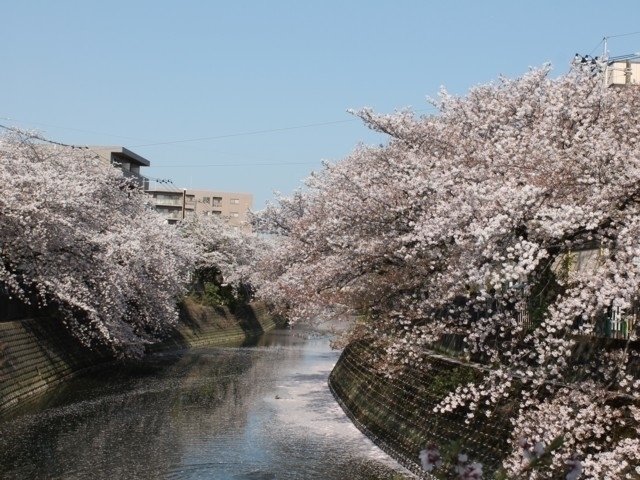 「かながわの花の名所100選」に選ばれた古くからの桜の名所。元住吉駅の近く、渋川に沿ってソメイヨシノが約2kmにわたって華やかに咲き誇る。桜並木の散策とともに、すぐ近くにある「中原平和公園」でもお花見を満喫できる。
